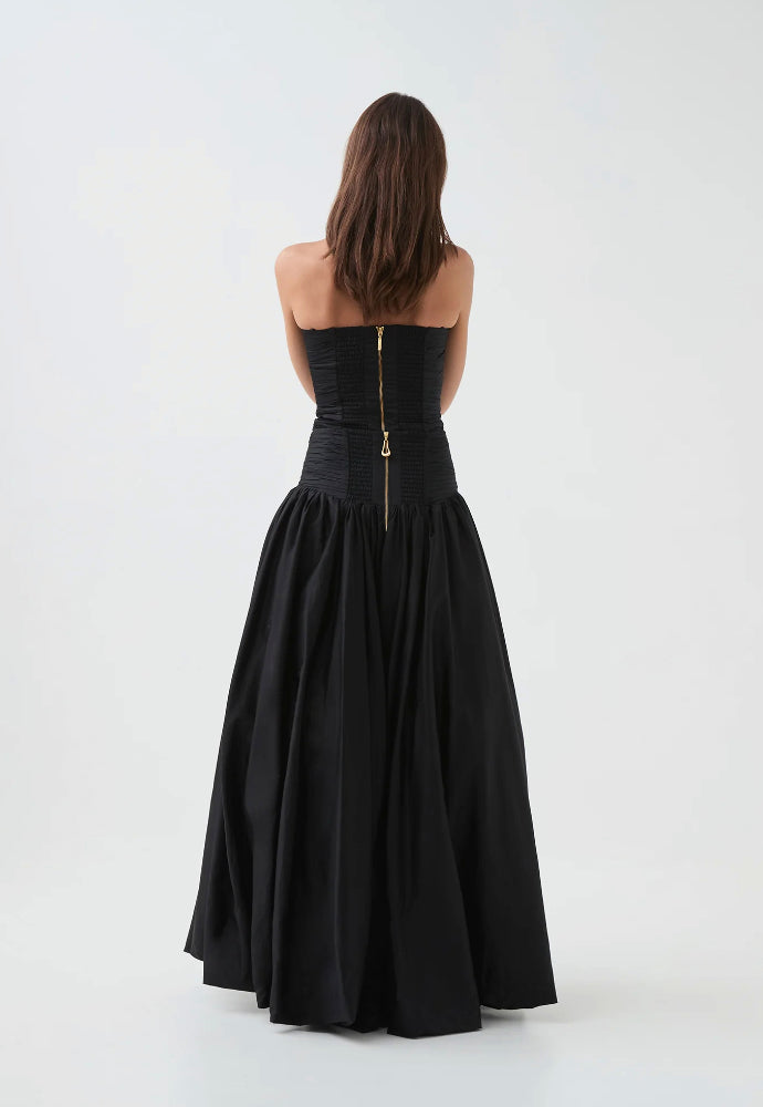 Featuring a straight neckline and a fitted, ruched bodice, this gown/ 2-piece set accentuates your curves beautifully. The gathered seam on the skirt adds a touch of sophistication, while the draped full skirt exudes elegance with every step. Adding a contemporary twist, the asymmetrical bubble hem lends a unique charm to the ensemble.