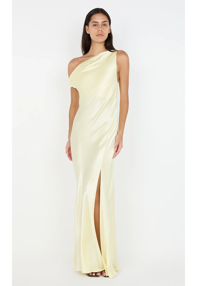 The Sol Asym Dress in Ice Yellow is a sophisticated maxi designed for those who appreciate refined tailoring and understated elegance. Its asymmetrical neckline and bias-cut construction create a flattering silhouette that skims the body gracefully, while bust darts and a mid-thigh split add subtle movement and dimension. Finished with a narrow-rolled hem and concealed side zip, this dress transitions seamlessly from bridesmaid duties to formal events and special occasions.