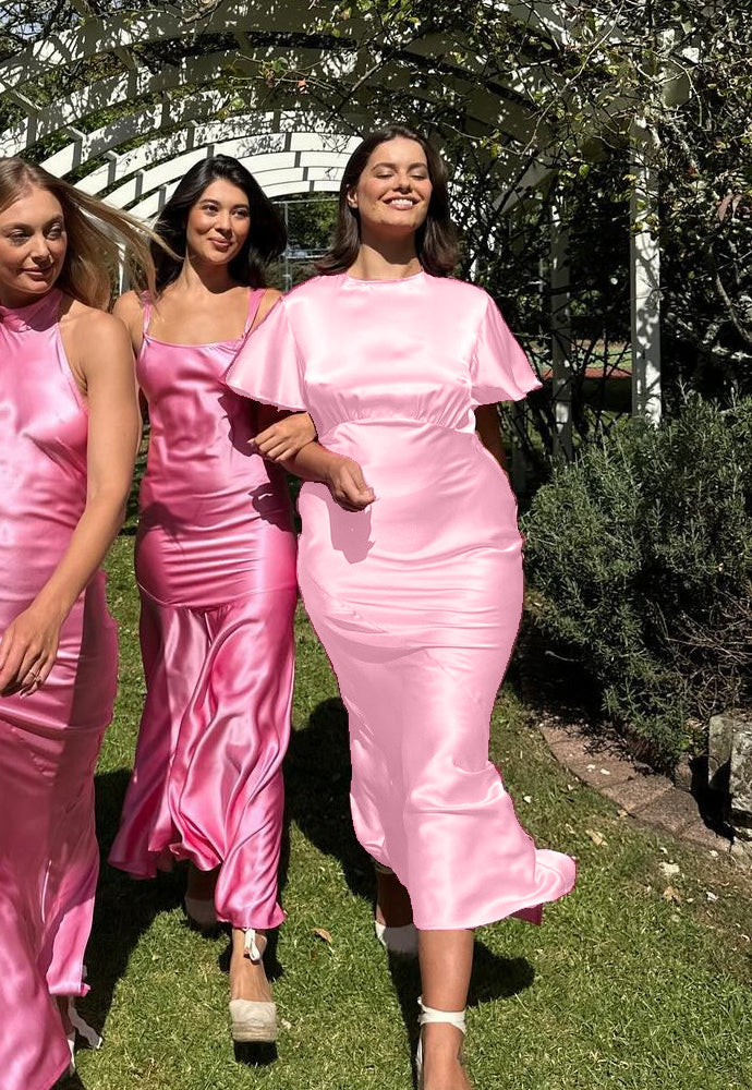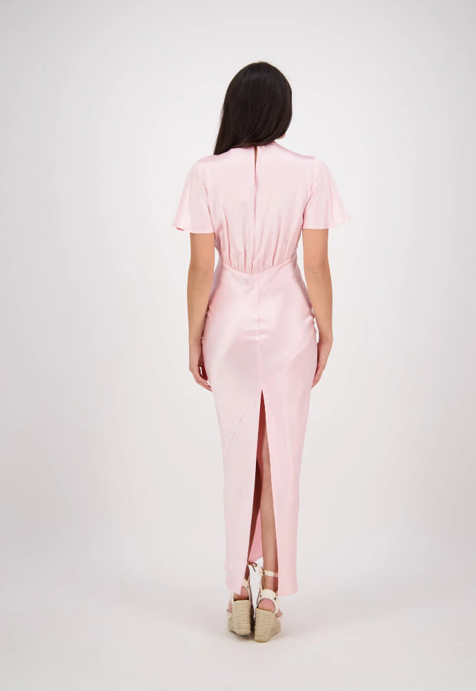 Beautiful silk dress featuring high neck, fluted short sleeves and bias cut. The actual colour of this dress is a pale cool toned pink shown in the second and third pictures.