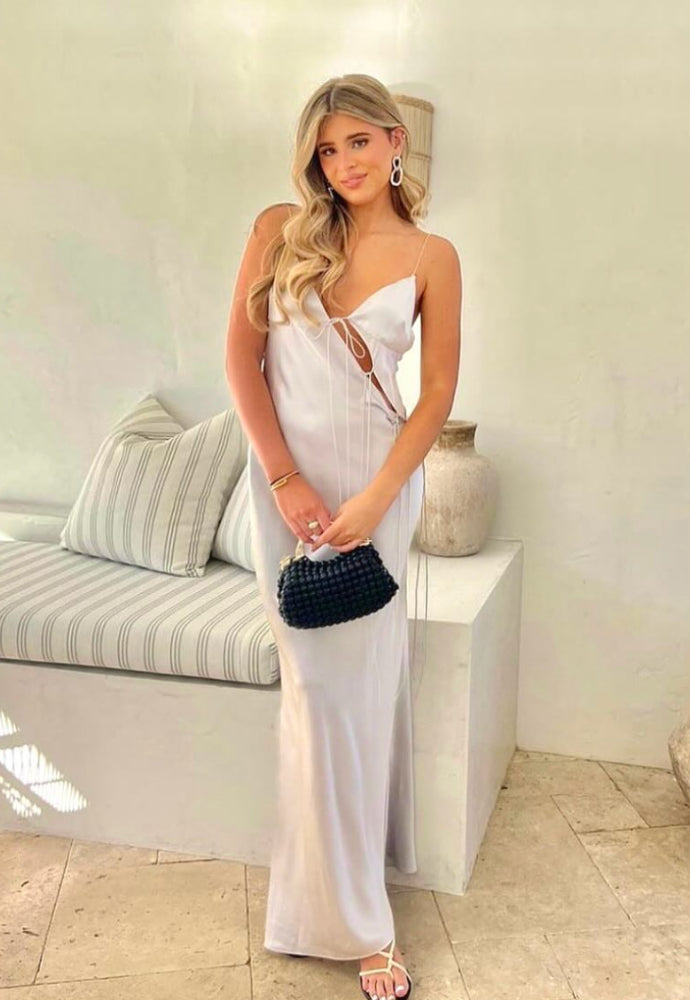 Christopher Esber's silk dress features a flowing design from its V-neckline and delicate spaghetti straps, elegantly completed with graceful self-tie accents. Characteristics include a V-neck, sleeveless style, and closure adorned with self-tie details, all crafted from luxurious 100% silk fabric.
