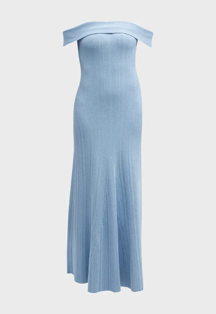 Crafted from a sumptuous cotton blend, this off-the-shoulder dress boasts a soft and pliable texture, ensuring both comfort and luxury. Its finely ribbed construction guarantees a sleek and flattering silhouette. Featuring a shoulder-baring neckline and a maxi A-line skirt that gracefully flares from the hip, this dress exudes effortless elegance. Transition seamlessly from day to night by pairing it with sandals and an unbuttoned shirt for a laid-back daytime look, then elevate it with heels and a clutch for evening sophistication.