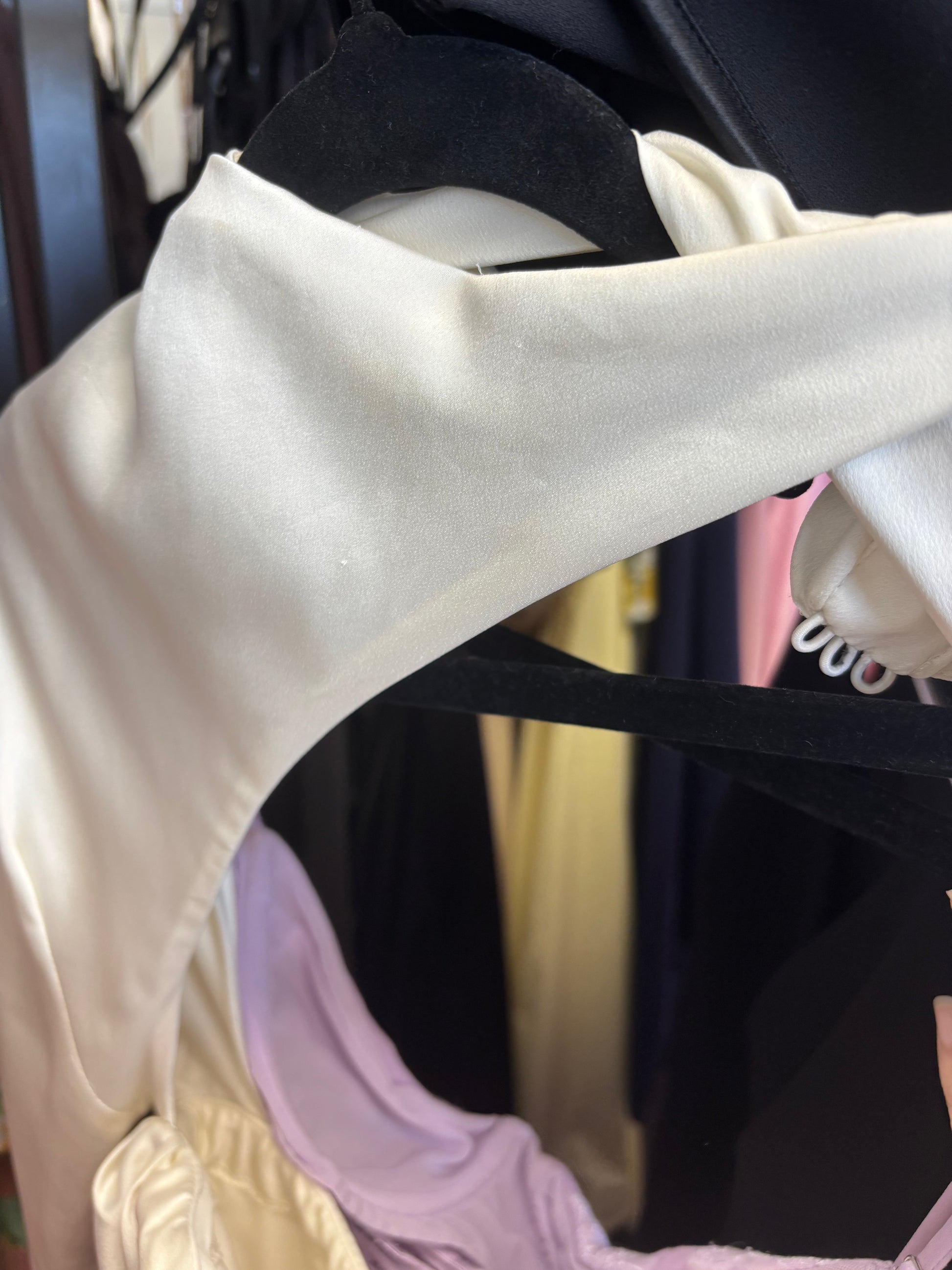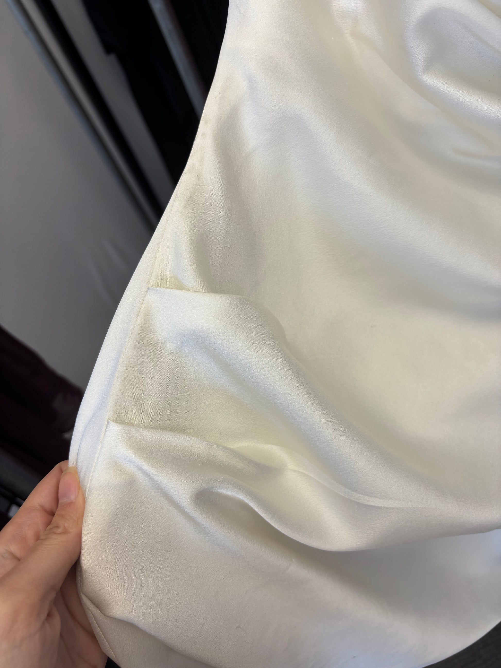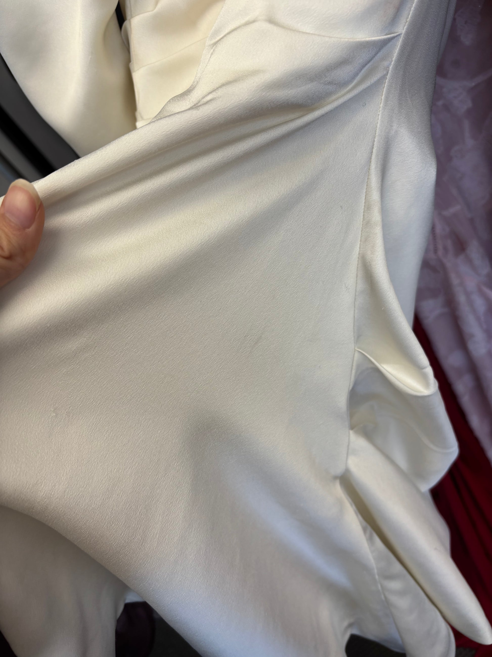 Listing is to purchase, some wear to fabric and slight marks. No returns. Gorgeous white mini, in satin. Featuring high neckline, A-line skirt and ruching along the bodice.